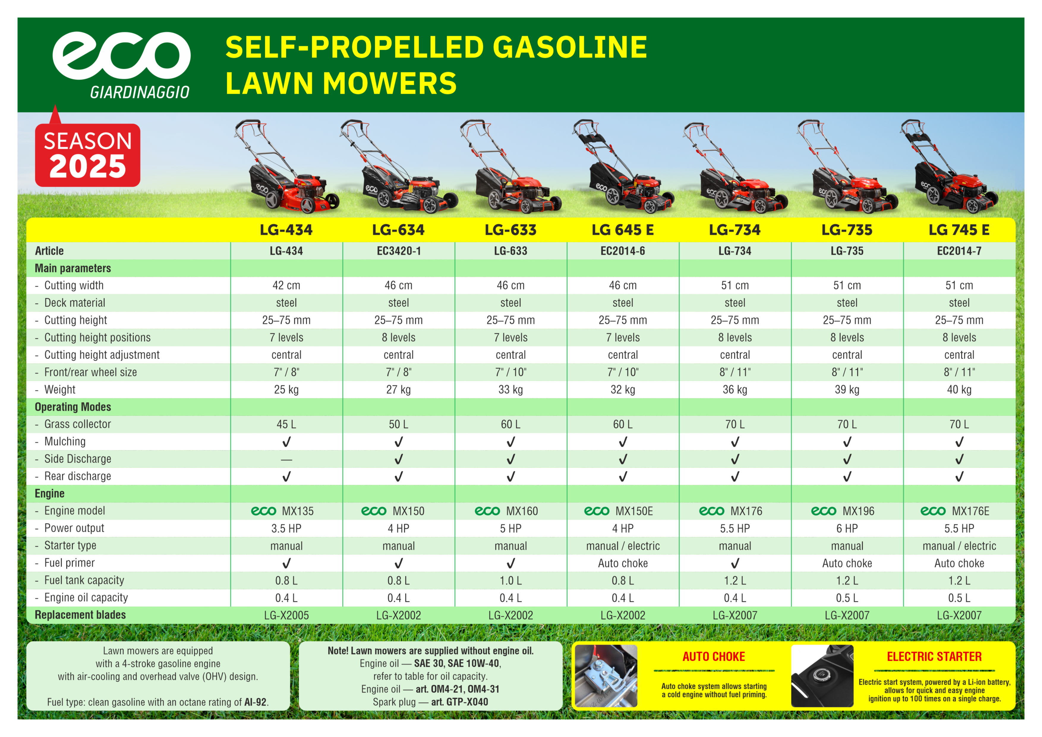 Gasoline lawn mower ECO LG-434 self-propelled (3.5 hp, cutting width 42 cm, self-propelled, mulching, steel deck, grass collector 45 L)