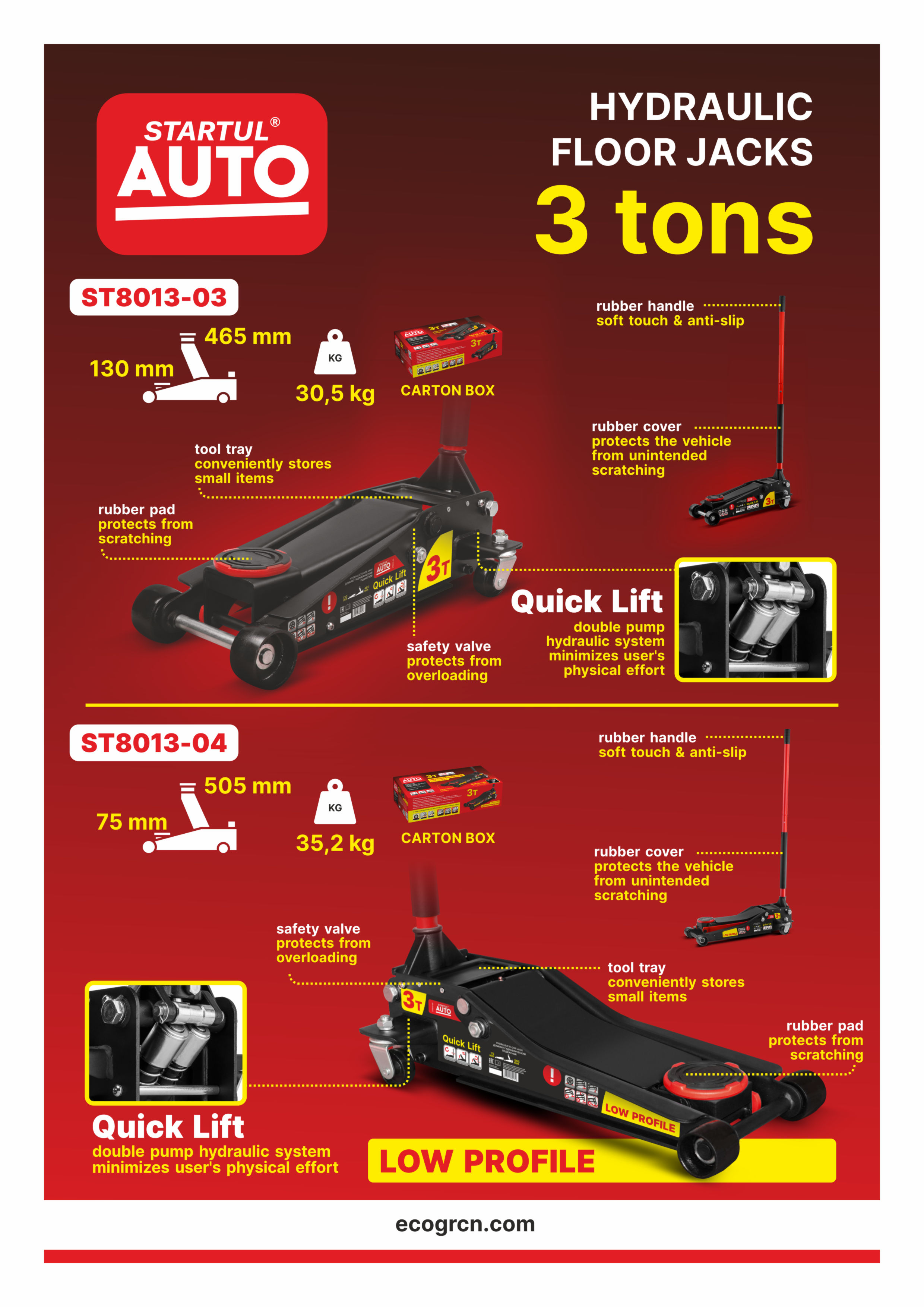 Floor jack 3tn 75-505mm Quick Lift STARTUL AUTO (low profile, double ram, safety valve, rubber pad)