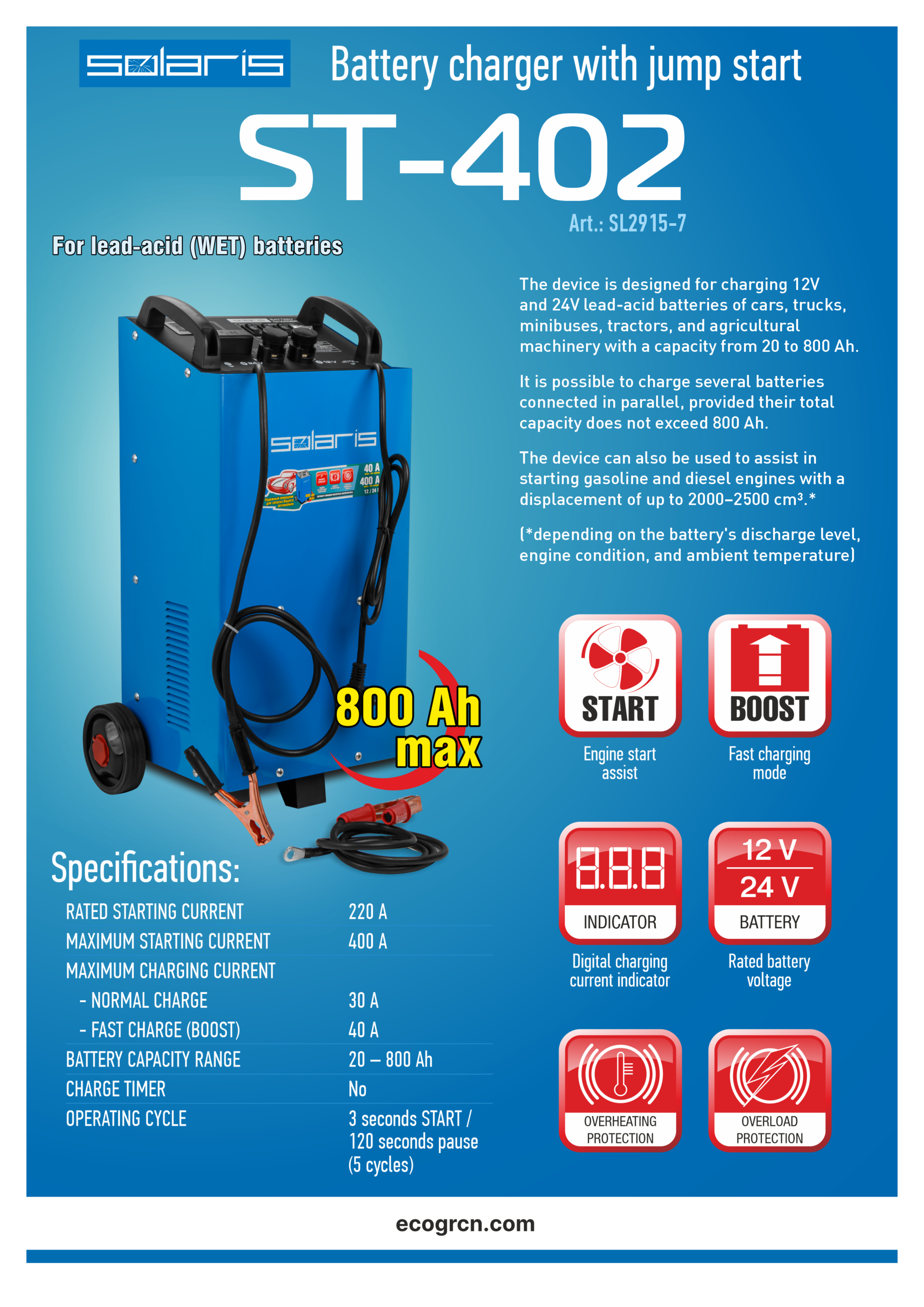 Note! The device does not replace the battery or restore the functionality of a faulty battery. Starting the vehicle without a battery installed or with a faulty battery may damage the device or the vehicle's on-board electronics. The ST-402 starting charger is designed to charge lead-acid 12 V and 24 V batteries of cars, trucks, minibuses, tractors, and agricultural machines with a capacity of 20 to 800 Ah. It is possible to charge several batteries when connected in parallel with different capacities, which should total no more than 800 Ah. The device can also be used to assist in starting gasoline and diesel engines with a volume of up to 2000-2500 cm3 (depending on the degree of battery discharge, engine condition and ambient temperature).