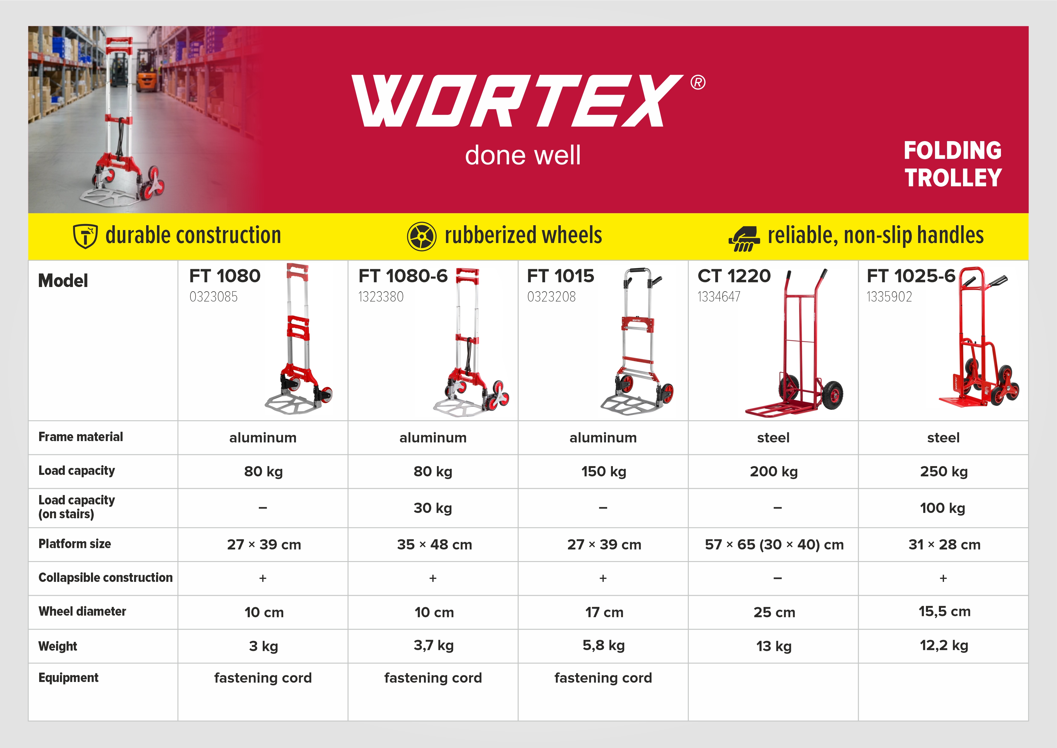 The folding trolley WORTEX FT 1080 differs from other competitors the high durability and reliability. It is designed to carry luggage, cases, boxes and other items of suitable size and weight. Also, thanks to the folding design, the trolley is easy and convenient to transport by any type of transport.