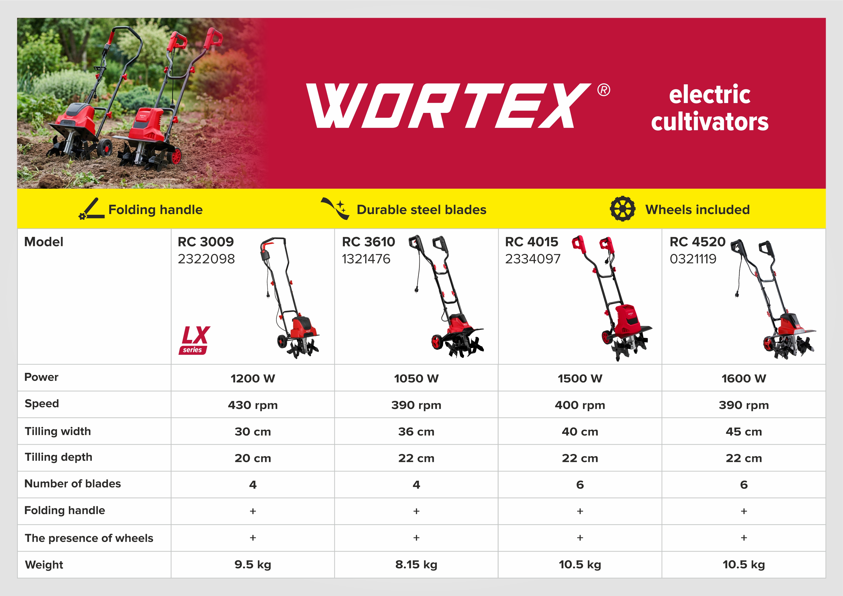 ■ Powerful 1600W motor, wide 45cm cultivation width, folding handle for storage.