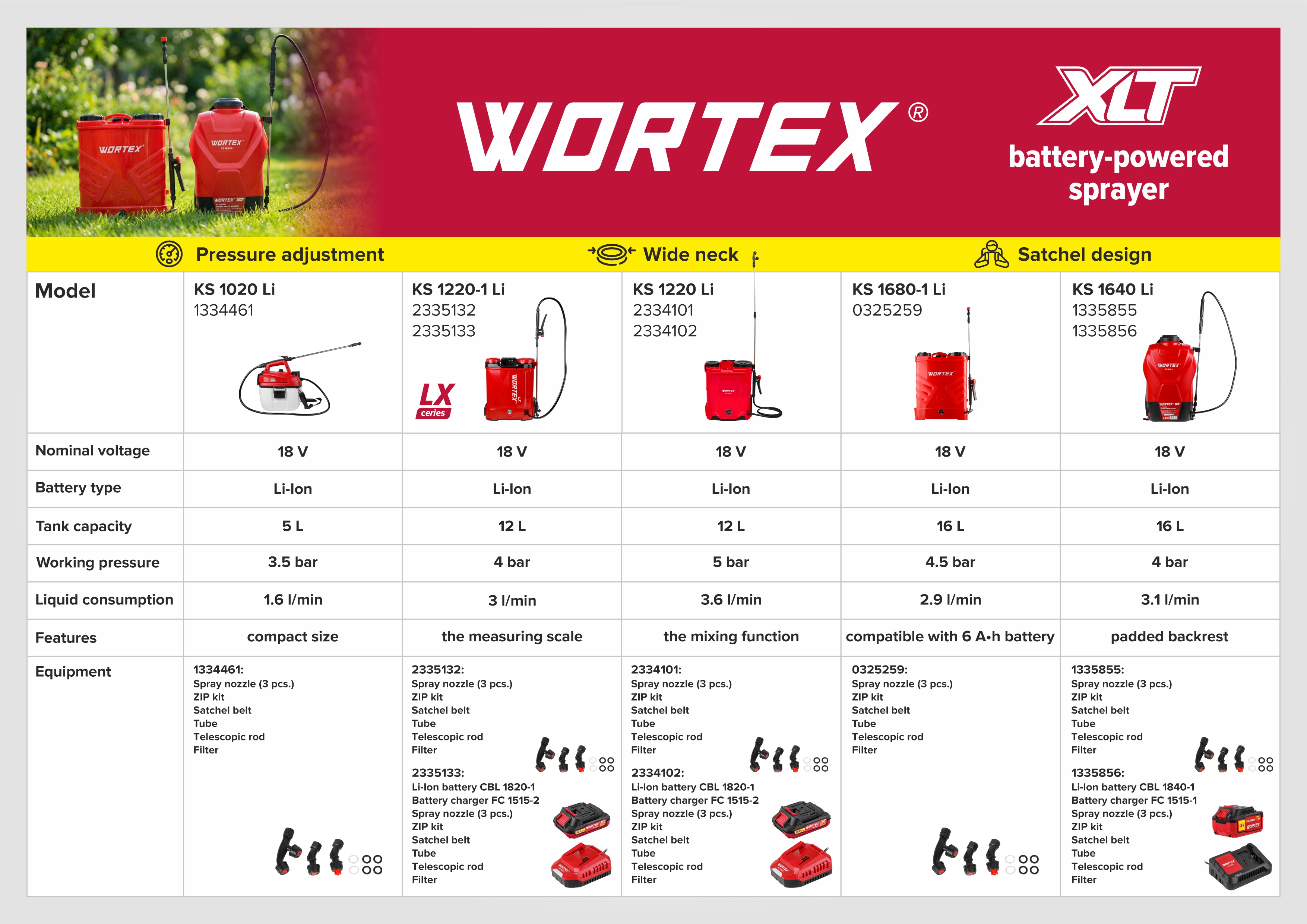 Cordless sprayer WORTEX KS 1680-1 Li XLT SOLO (18V, 16 L, 2.9 L/min, 0.15-0.45 MPa, telescopic rod (40-80 cm))