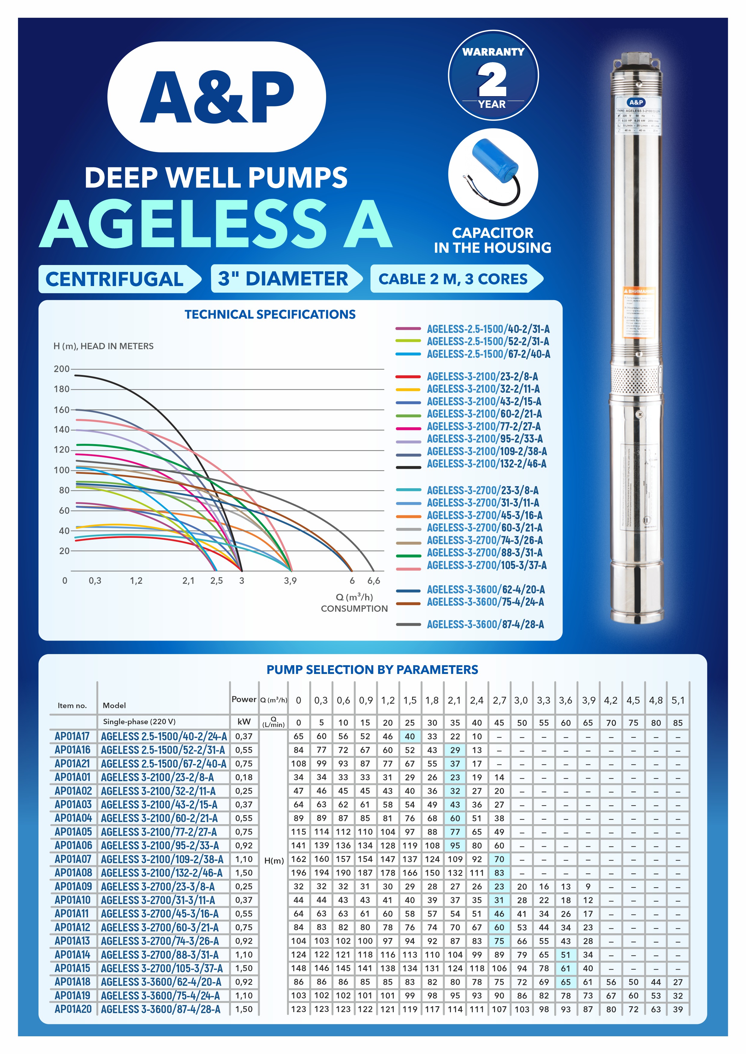 Deep well centrifugal pump AGELESS-3-2100/43-2/15-A A&P (Centrifugal multistage, 370 W, 2.7 m3/h, 60m head, 3" / 7.62 cm)