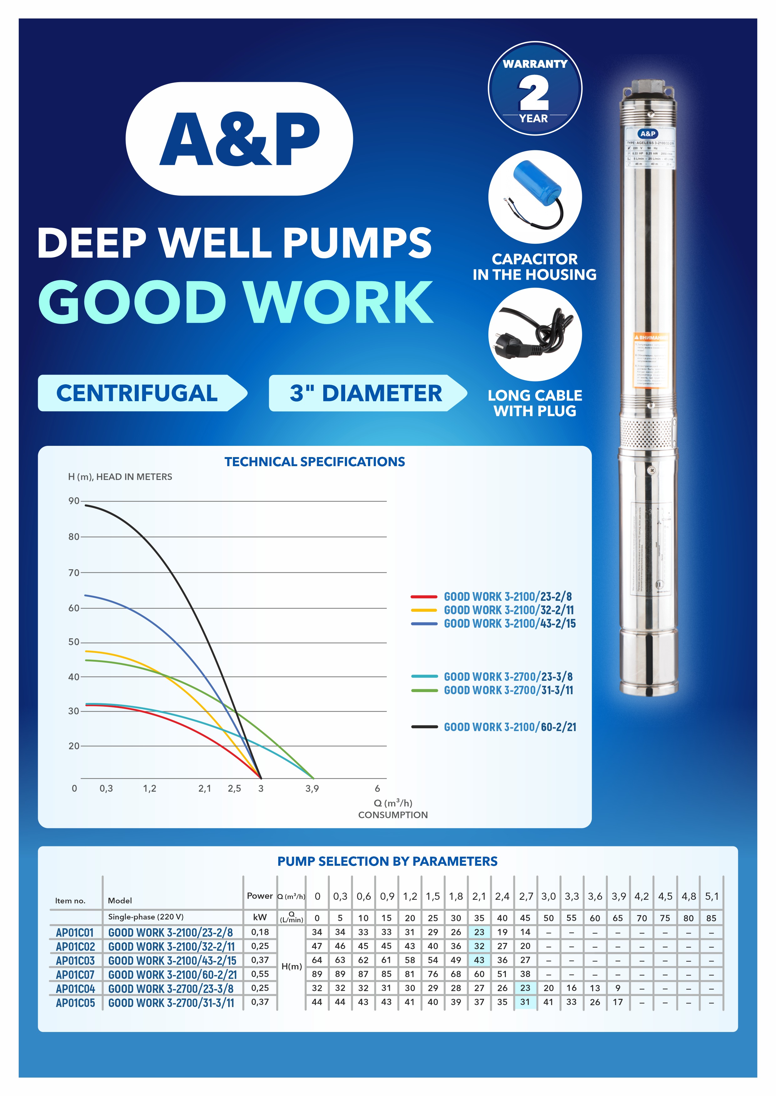 Deep well centrifugal pump GOOD WORK 3-2100/43-2/15, A&P (Centrifugal multistage, 370 W, 2.7 m3/h, 64m head, 3" / 7.62 cm)
