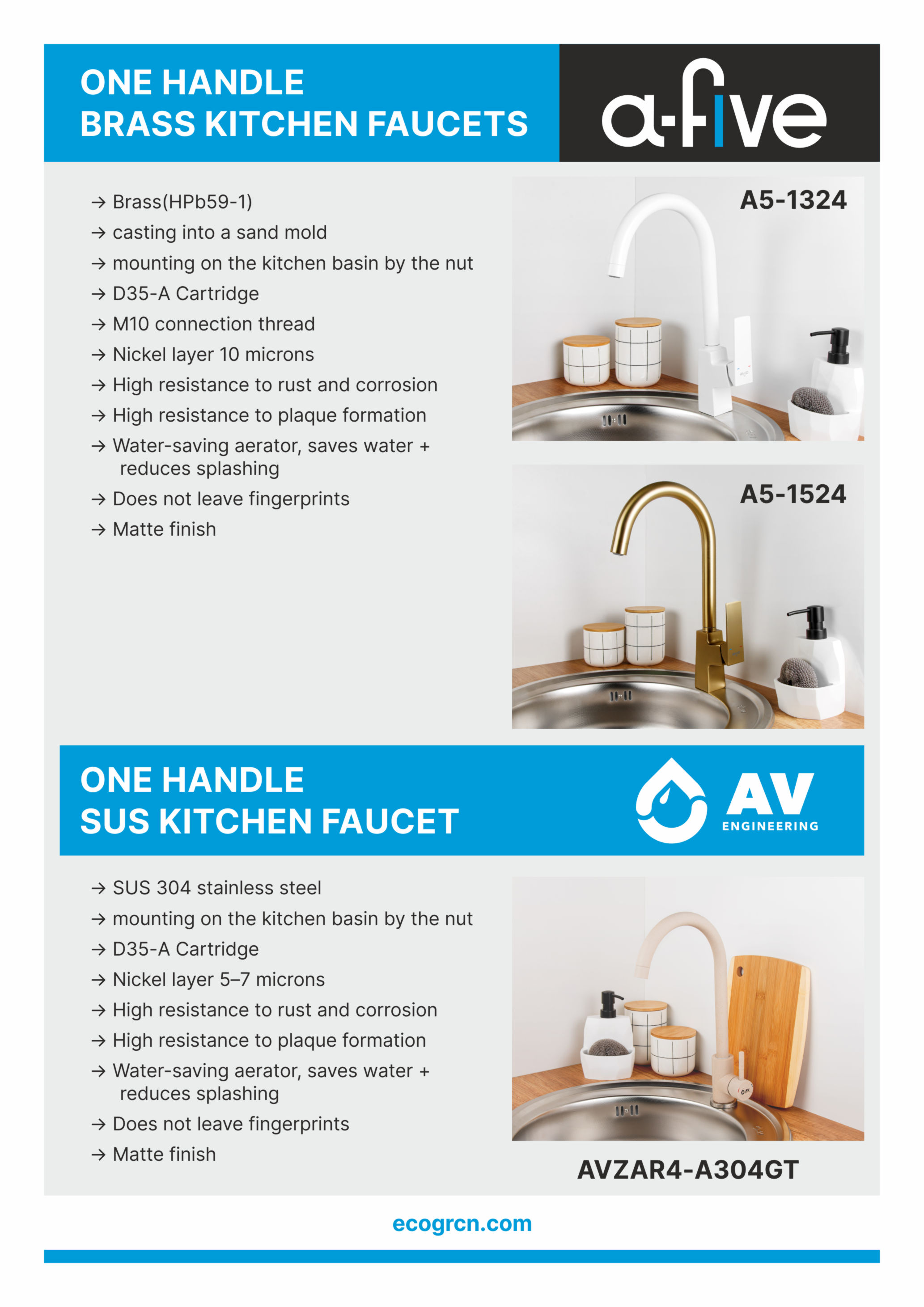 a-five faucets combine the aesthetics of modern style, ease of use, reliability - only high quality brass. Choosing the right faucet is equivalent to choosing a truly comfortable lifestyle. The functional features of this faucet will allow you to open, close and control the flow of water every day with ease and comfort. Not only the appearance of our faucets can attract you, but also their high quality - Service life of the body at least 15 years