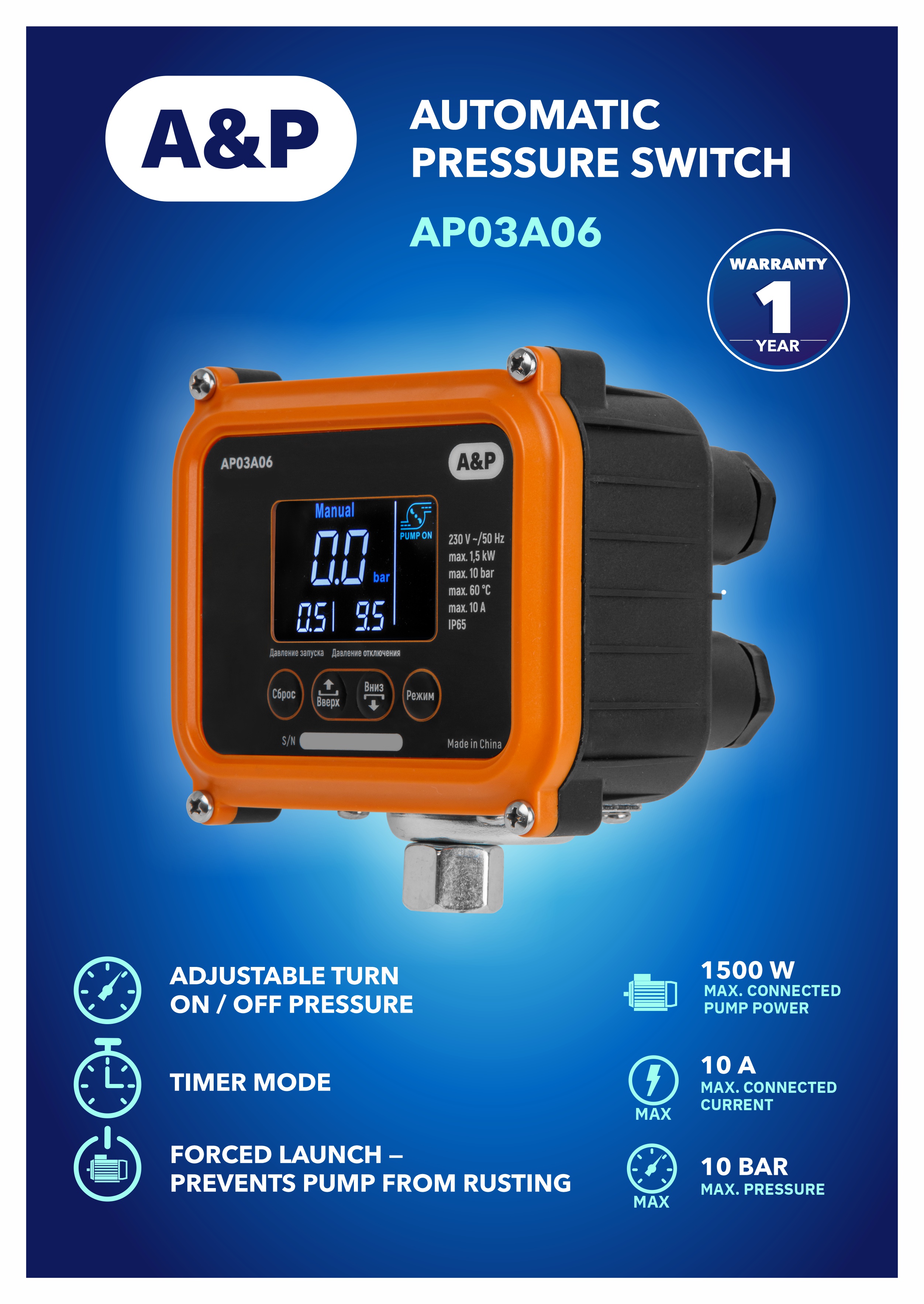 The pressure switch consists of a housing, inside which there is a normally closed contact group controlled by a diaphragm connected to the pressure line. The relay switches the pump on when the system pressure falls below a set value and switches the pump off when the system pressure reaches the set switch-off value.
