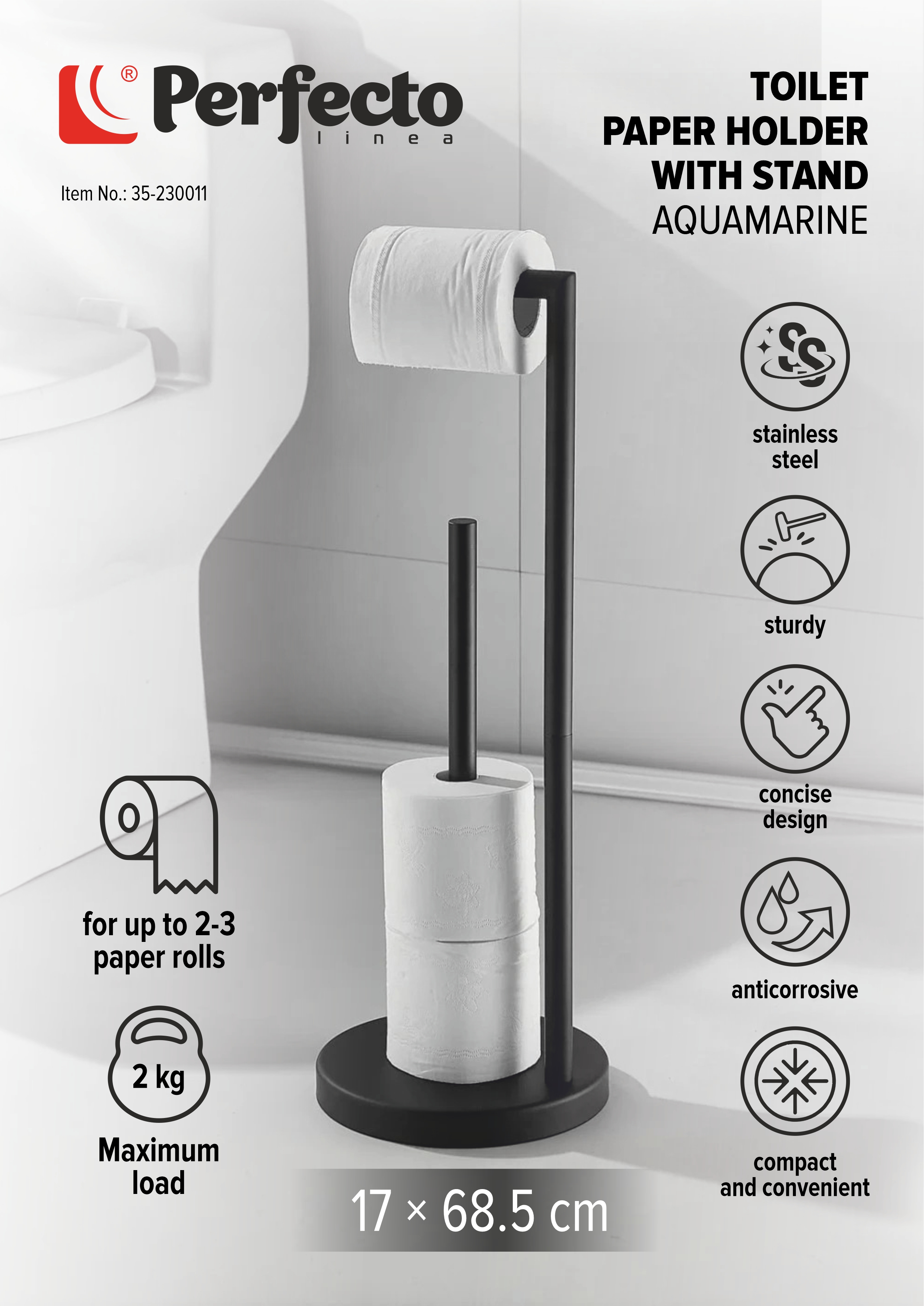The floor-mounted toilet paper holder will always keep your bathroom and toilet in order. The toilet set neatly stores spare rolls in one place. Now you don't have to worry about running out of paper unexpectedly. The sleek toilet paper holder is crafted from metal and the sturdy construction is durable for everyday use. Thin metal lines of the toilet paper holder make it elegant and concise. An anti-slip mat is provided on the base of the holder. Buy with the product: 35-191002, Soap dispenser with sponge holder PEARL, white, PERFECTO LINEA; 35-000011, Soap dispenser MARBLE, black, PERFECTO LINEA; 35-720101, Soap dispenser WOOD BLISS, black, PERFECTO LINEA; 35-151101, Soap dispenser WEATHERED SAND, black, PERFECTO LINEA; 35-005035, Toilet brush BLACKSTONE, black, PERFECTO LINEA; 35-151501, Toilet brush WEATHERED SAND, black, PERFECTO LINEA.