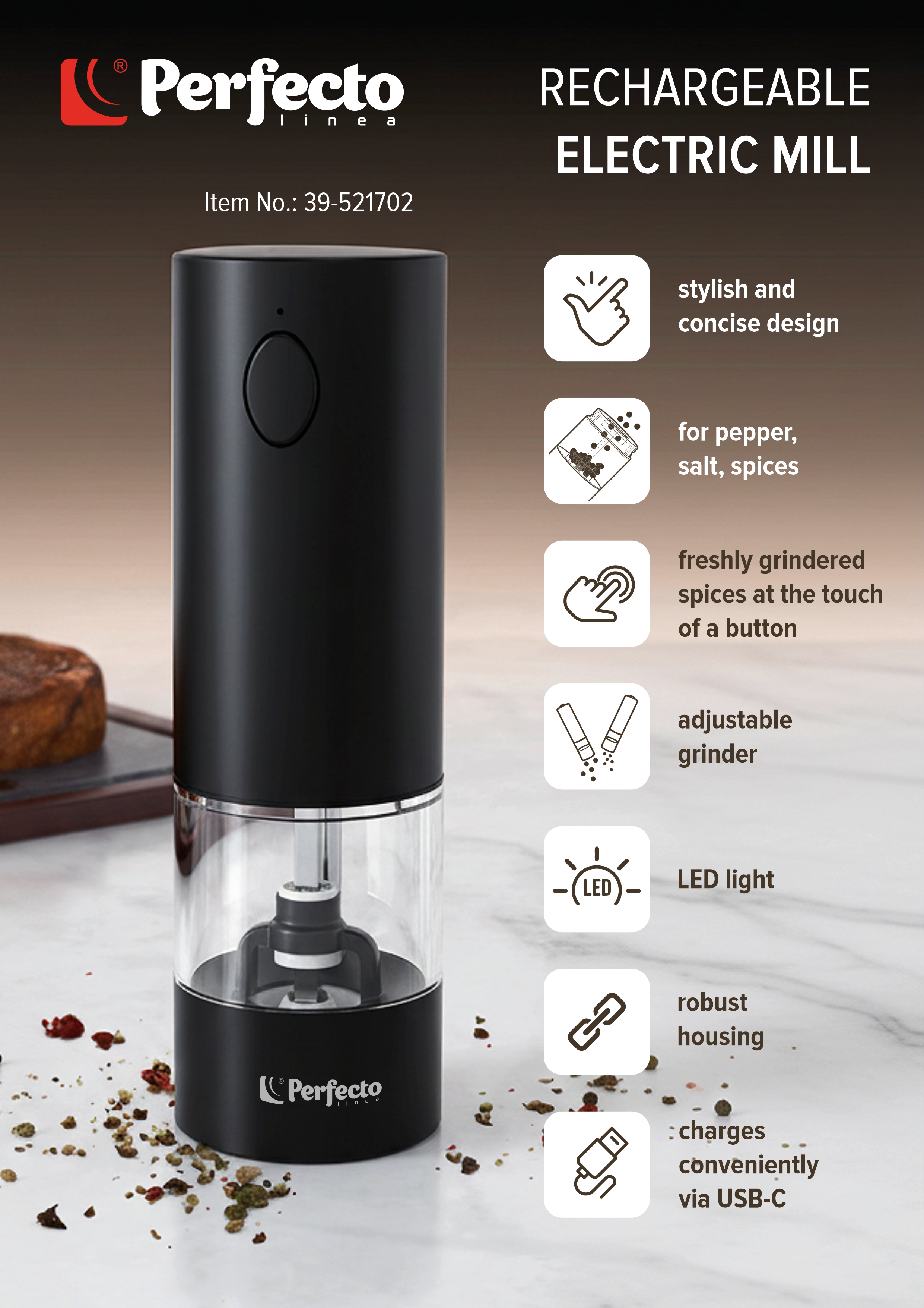 Electric mill, 5.2 x 17 cm, black, accumulator, CHEF, PERFECTO LINEA (size: 5.2 x 17 cm, black,accumulator)