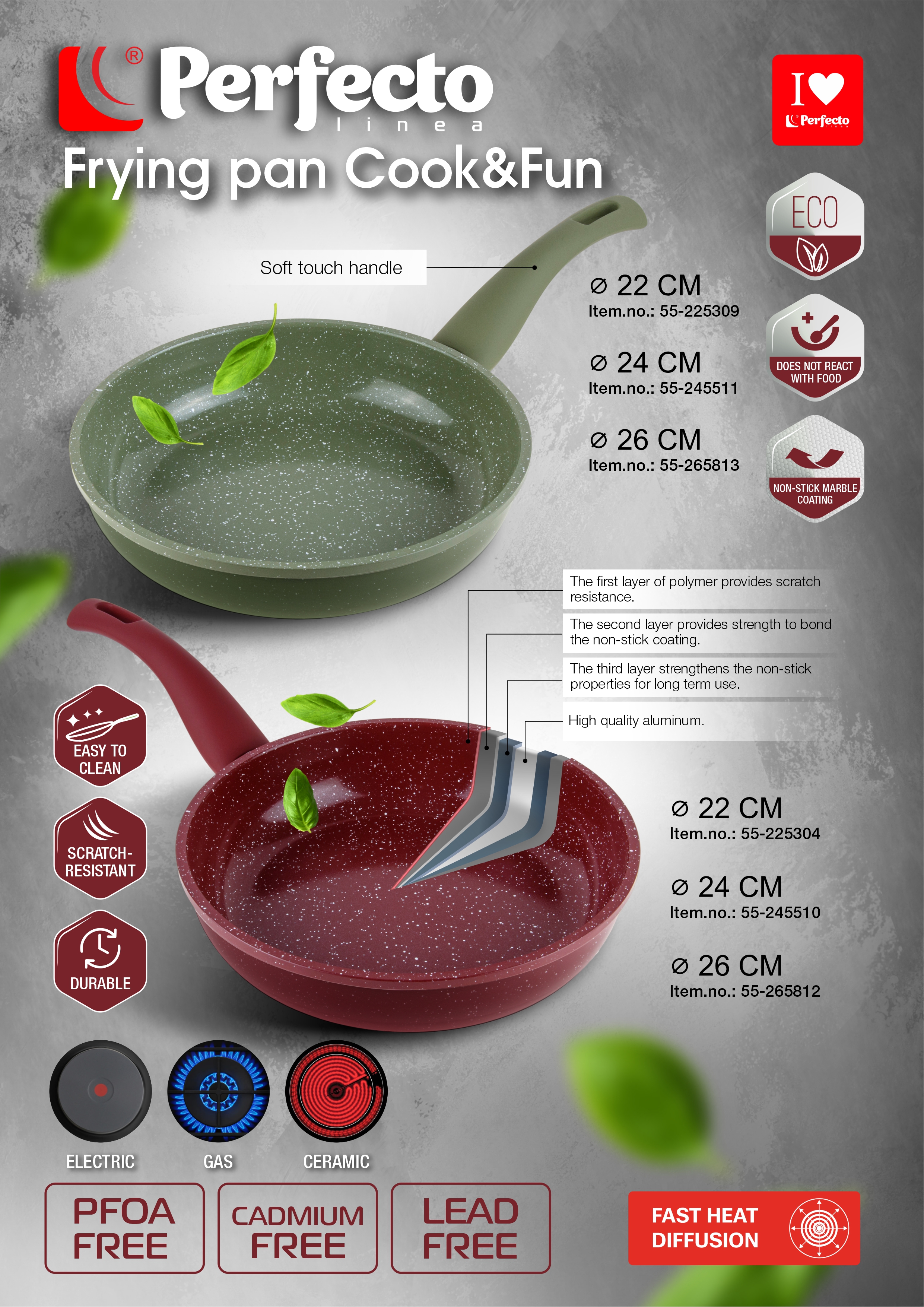 Frying pan 24х5.5 cm, aluminum, non-stick coating, Cook&Fun series, natural green, PERFECTO LINEA (Diameter: 24 cm.Material: aluminum.Handle material: bakelite with soft touch.)