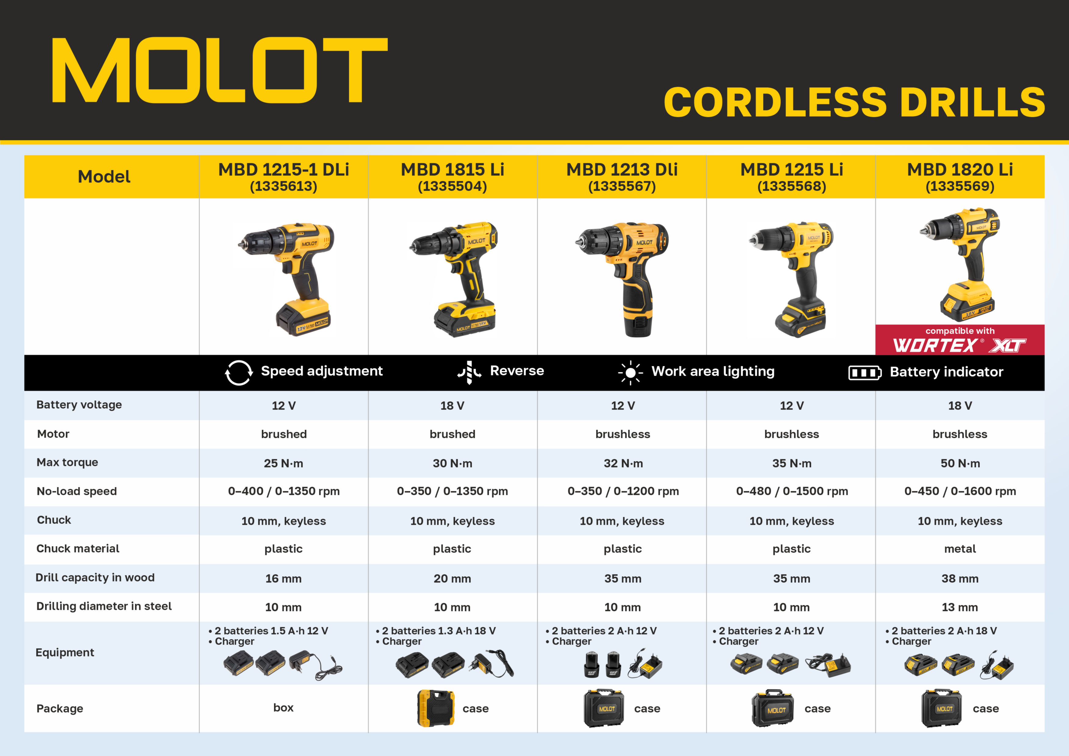 Cordless drill MOLOT MBD 1820 Li (BL, 18V, 50 N·m, 0-450/1600 rpm, 10 mm chuck, 2x2 Ah)