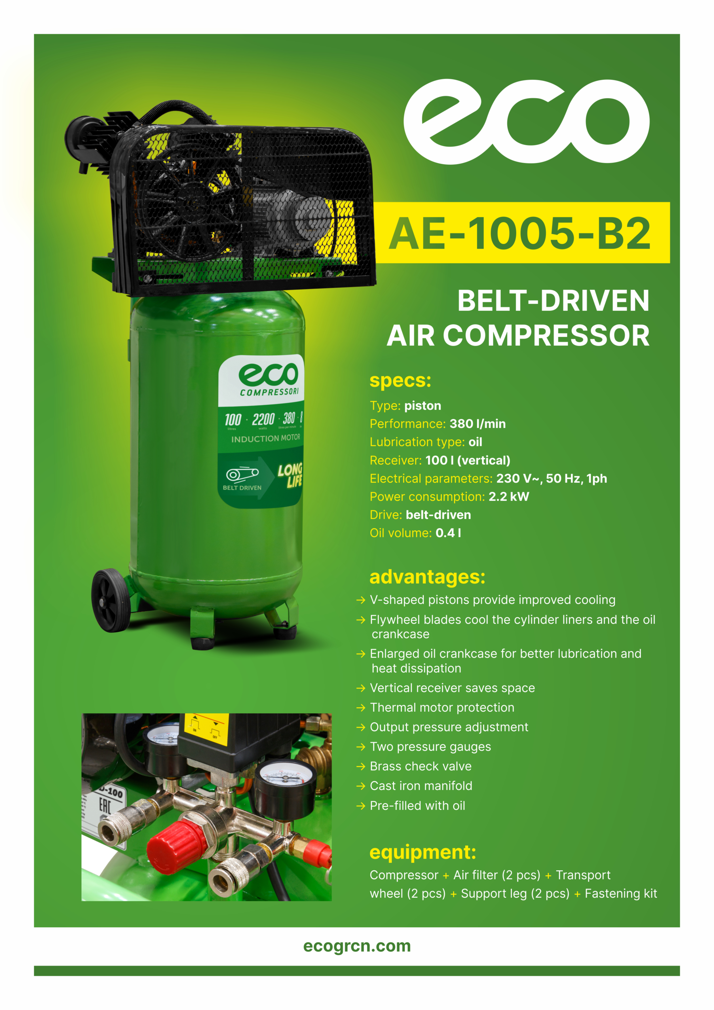 Air compressor ECO AE-1005-B2 belt drive (oil-lubricated, 230 V~, 50 Hz, 1ph, 2.2 kW, 380 l/min, 8 bar, 100 l, belt-driven)